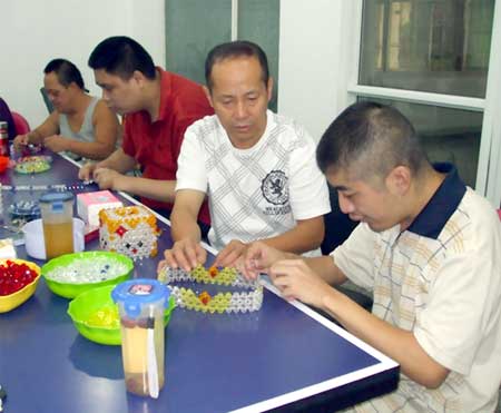 在街道“真爱空间”工疗站,细心教智障残疾人学习手工艺品制作